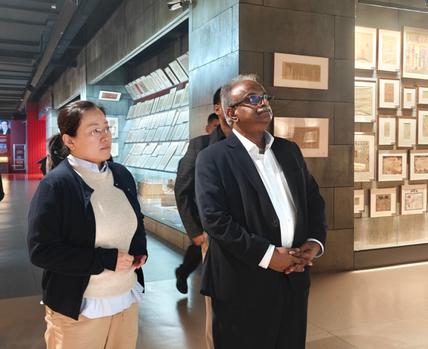 访问期间,代表团还实地参观了力明红色文化和思政教育观摩基地。面对馆藏的珍贵红色文物与文献,赛尔瓦拉吉·奥彦·皮莱副校长对学院以红色文化铸魂育人的举措表示高度认可,认为这为国际教育交流增添了独特的文化维度。